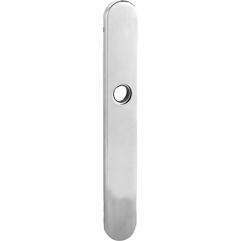 Edelstahl matt, Lochung für Drücker Ø 20 mm, Grundplatte mit 3 Gewindenocken M6, Mitte Drücker bis Mitte oberes Schraubenloch 79 mm, ohne Schrauben