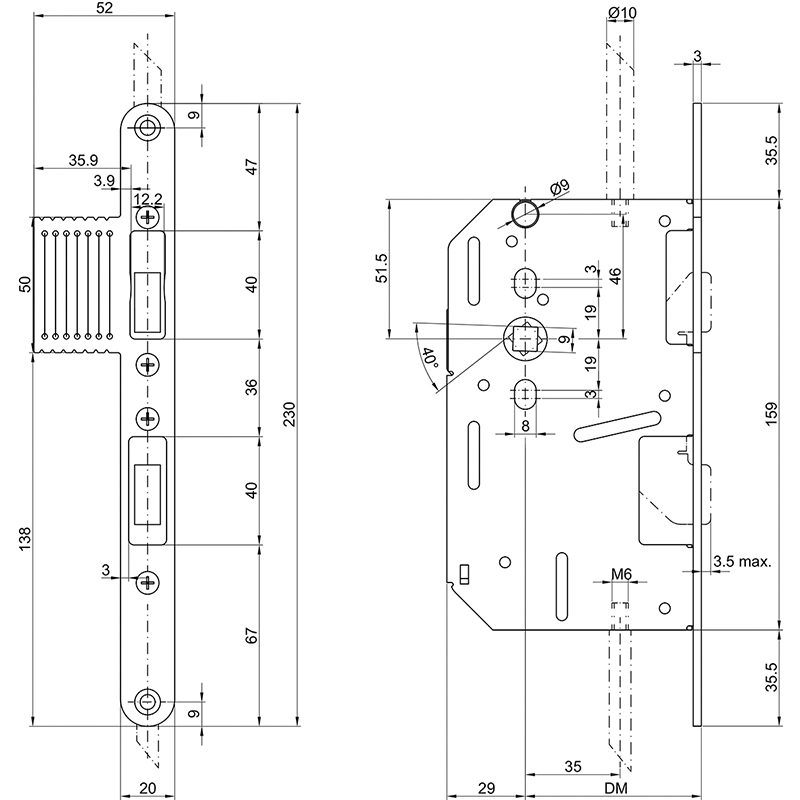 - In Verwendung mit den Panikschlössern 1714PE-ZF, 1717PB-ZF in zweiflügligen Holztüren.