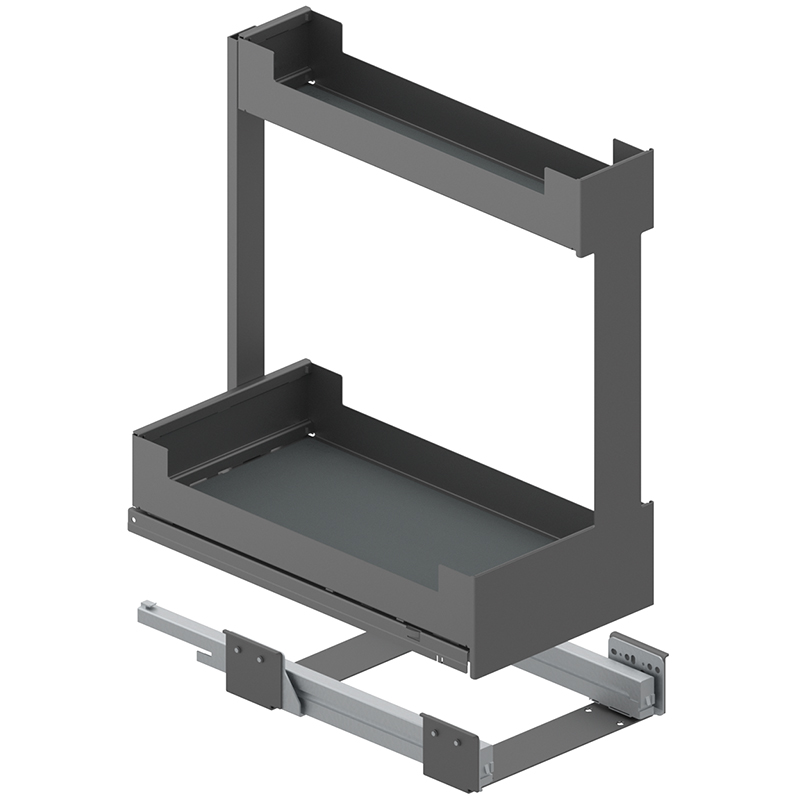 Stahlblech pulverbeschichtet, Vollauszug, integrierter Softclose, Frontauszug öffnen und Innenauszug mit 2 Etagen Staufläche herausziehen, Tragkraft 0 - 25 Kilo, mit Korpusschiene Nova Pro, ohne Relingeinsatz-Set