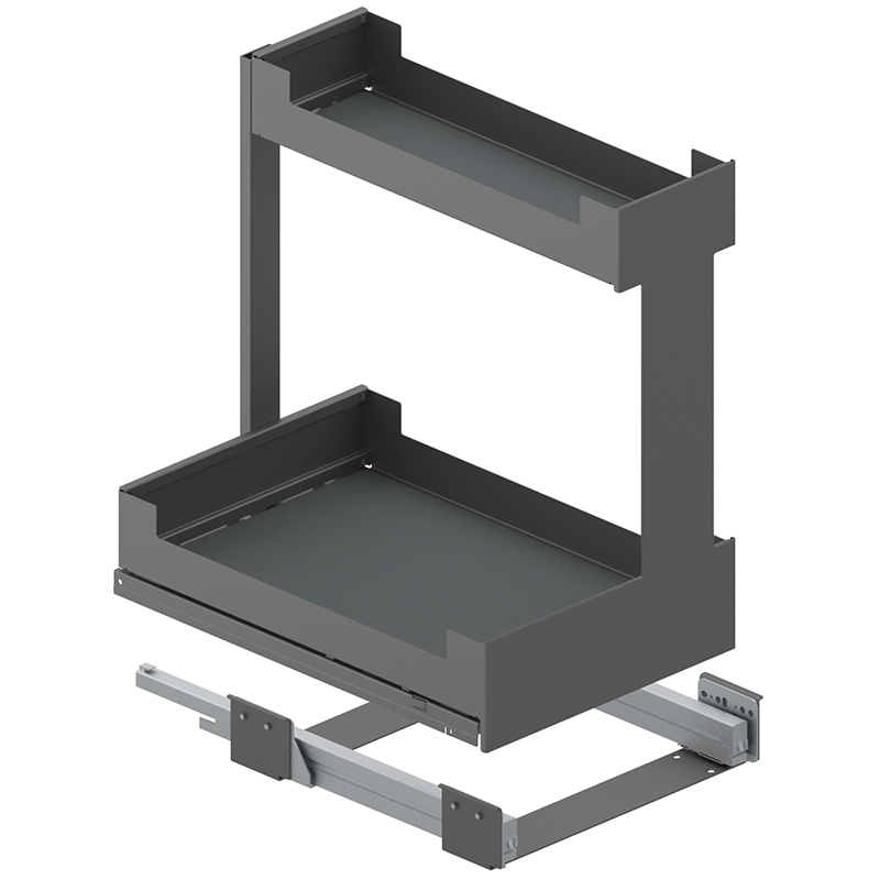 Stahlblech pulverbeschichtet, Vollauszug, integrierter Softclose, Frontauszug öffnen und Innenauszug mit 2 Etagen Staufläche herausziehen, Tragkraft 0 - 25 Kilo, mit Korpusschiene Nova Pro, ohne Relingeinsatz-Set