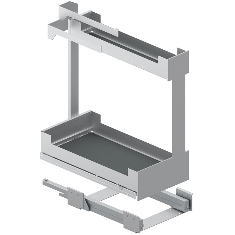 Stahlblech pulverbeschichtet, Vollauszug, integrierter Softclose, Frontauszug öffnen und Innenauszug mit 2 Etagen Staufläche herausziehen, Tragkraft 0 - 25 Kilo, mit Korpusschiene Nova Pro, ohne Relingeinsatz-Set