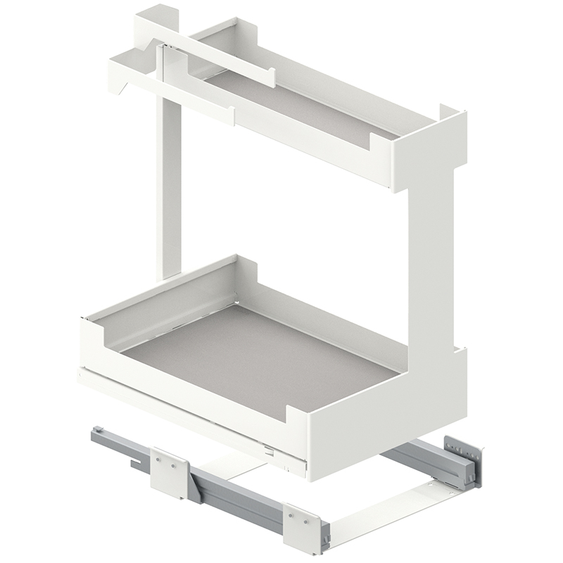 Stahlblech pulverbeschichtet, Vollauszug, integrierter Softclose, Frontauszug öffnen und Innenauszug mit 2 Etagen Staufläche herausziehen, Tragkraft 0 - 25 Kilo, mit Korpusschiene Nova Pro, ohne Relingeinsatz-Set