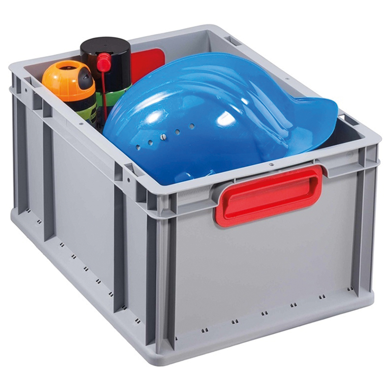 Schwerlast-Transport-Stapelkästen in Industriequaliät, rippenverstärkte Wände verleihen dem Behälter eine gute Formstabilität, der umlaufende Rand wirkt verriegelnd und selbstzentrierend, beständig gegen Öle, Fette und die meisten Säuren und Laugen, dank ergonomisch geformten Griffmulden auch bei schweren Belastungen sehr gut zu tragen