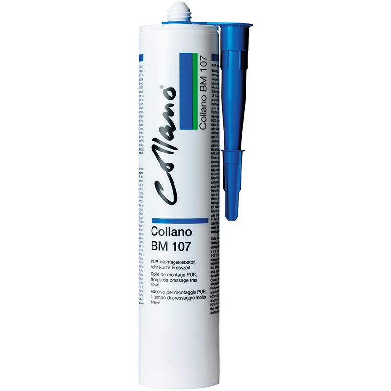 PUR-Montageklebstoff, sehr kurze Presszeit, für Holzwerkstoffe, Stein, Keramik, Isolationsmaterialien und Beton, speziell für alle Montagearbeiten sowie für nicht brennbare Bauplatten, im Innen- und Aussenbereich geeignet