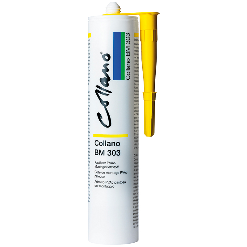 Pastöser PVAc-Montageklebstoff, für Gipsfaser- und Holzwerkstoffplatten, Stein, Keramik, Isolationsmaterialien, zementgebundene Spanplatten und Beton, speziell für Montagearbeiten in Innenräumen geeignet