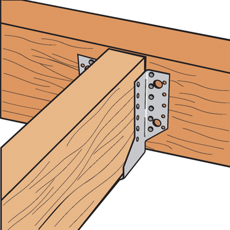 Stahlblech feuerverzinkt, Lappen nach Aussen gebogen, für Anschlüsse von Nebenträger an Hauptträger oder an Stützen, auf Zug belastbar, im Hallenbau ohne zusätzliche Verbinder als Verbandsstäbe einsetzbar, versetzte Nagelanordnung im Nebenträger für schmale Hölzer ab einer Breite von 38 mm, mit aufgedruckter Chargennummer, Nagelloch-Ø 5 mm, Materialstärke 2 mm