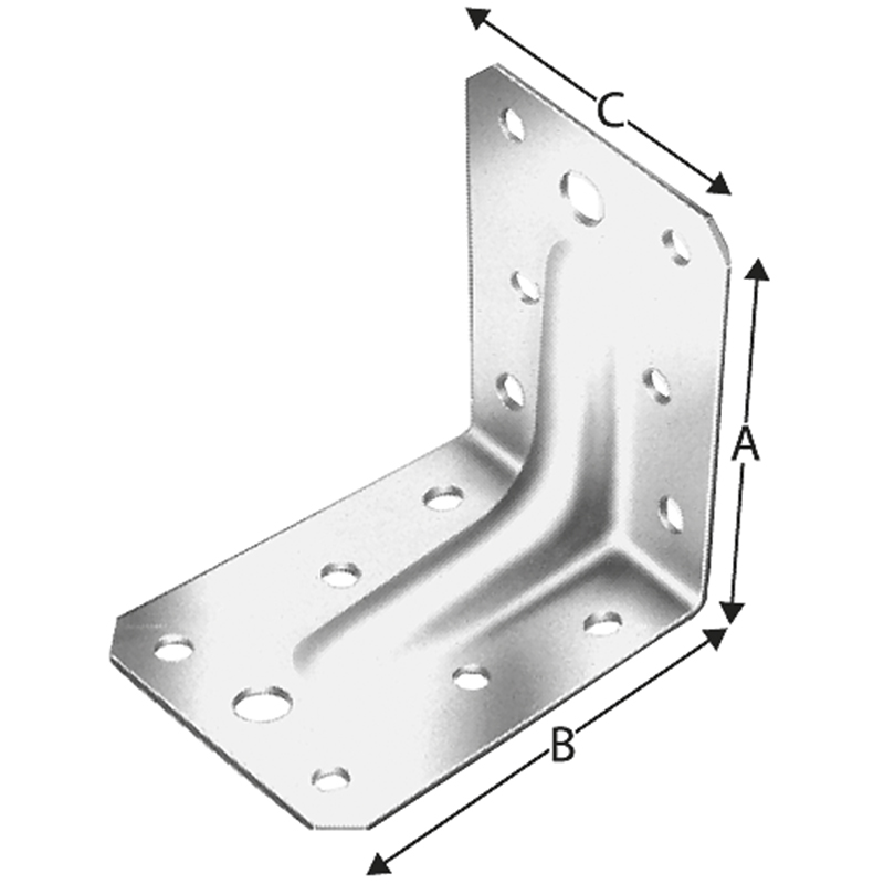 Stahlblech feuerverzinkt, mit Nagel- und Bolzenloch, sind besonders für Anschlüsse geeignet, bei denen grosse Kräfte übertragen werden müssen, mit Rippenverstärkung, zur Befestigung auf Beton oder Stahl können Bolzenanker M8 oder M10 eingesetzt werden