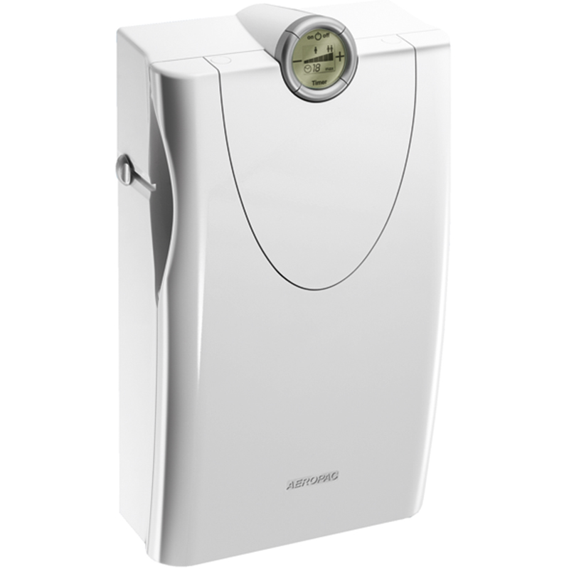 Kunststoffgehäuse weiss hochglanz, für Wandmontage, Einzelraumlüftungsgerät sorgt geräuscharm für eine kontrollierte und energiesparende Belüftung von Wohn- und Schlafräumen, seitlicher Luftaustritt links und rechts zur Vermeidung von Zuglufterscheinungen, mit 2 separat von Hand bedienbaren Verschlussklappen, die Luft kann getrennt nach rechts, links oder durch beide Öffnungen in den Raum geleitet werden, Filterkassette durch Aufklappen des Deckels leicht zu entfernen, temporär beleuchtetes LCD-Display mit hohem Bedienkomfort, mit Anzeige der Luftmenge im Balkendiagramm, personenbezogene Anzeige sowie Powerstufe, integrierte Zeitschaltautomatik, durch Nutzer einstellbar, verdeckter Betriebsstundenzähler, Filterwechselanzeige, mit Grobstaubfilter G3, Wetterschutz, PVC-Lüftungsrohr Ø 80 x 500 mm, komplett mit Schrauben und Dübeln, Montage-, Bedienungsanleitung und Bohrschablone, elektrischer Anschluss 230 V AC / 0,14 A