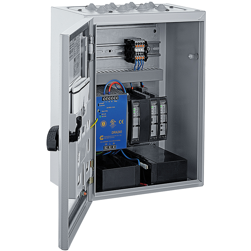 Blechgehäuse RAL7035 grau, Notstromsteuerzentrale für RWA-Antriebe mit einer Gesamtstromaufnahme von 8 A, mit Akku