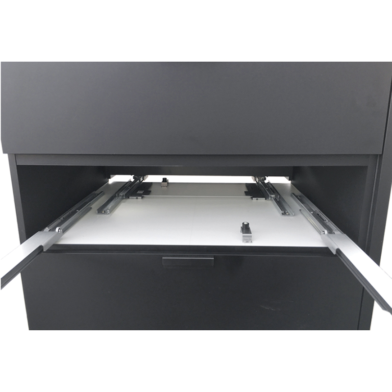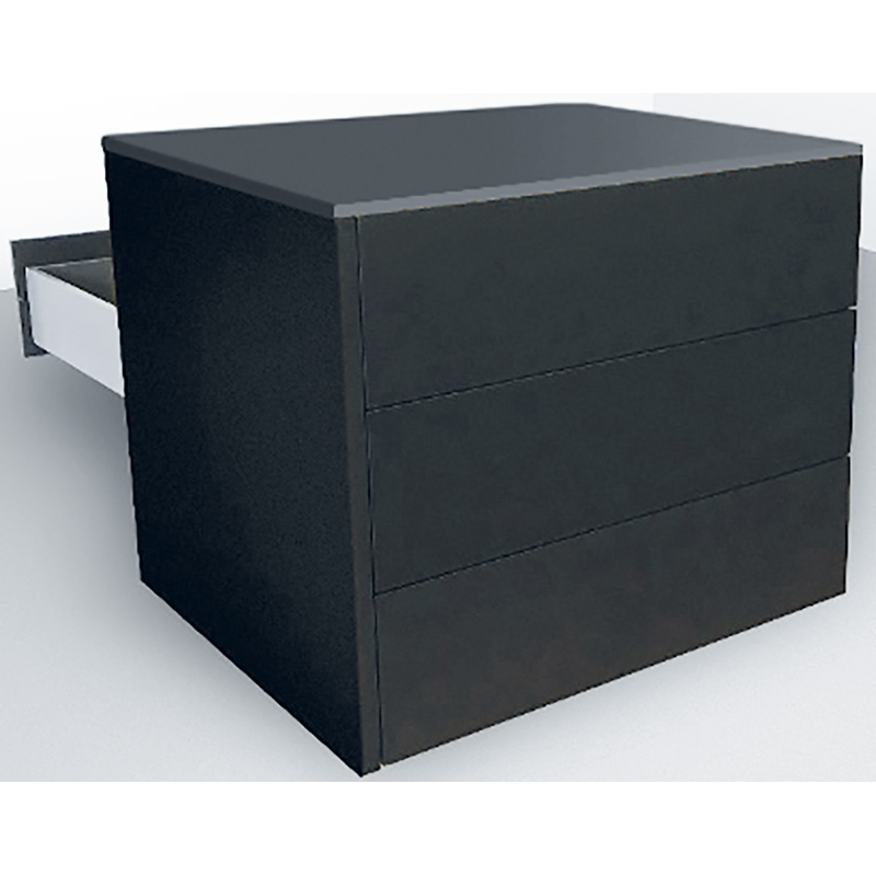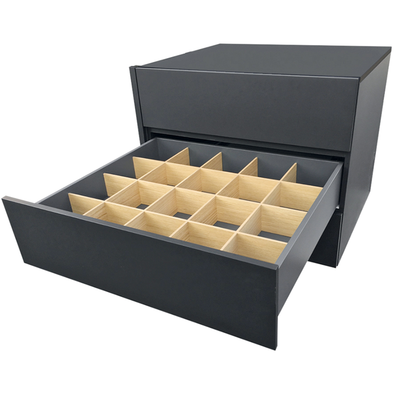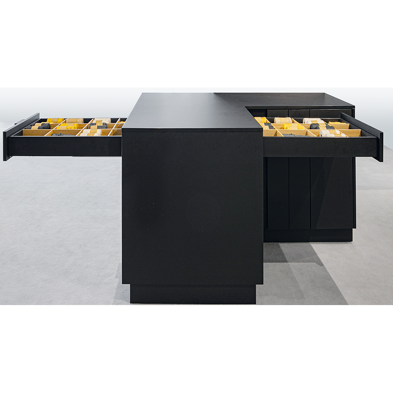 verzinkt, beidseitig ausziehbare Schublade mit aufschlagender Front für Möbelinseln und Raumteiler