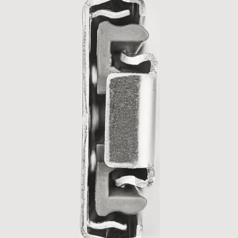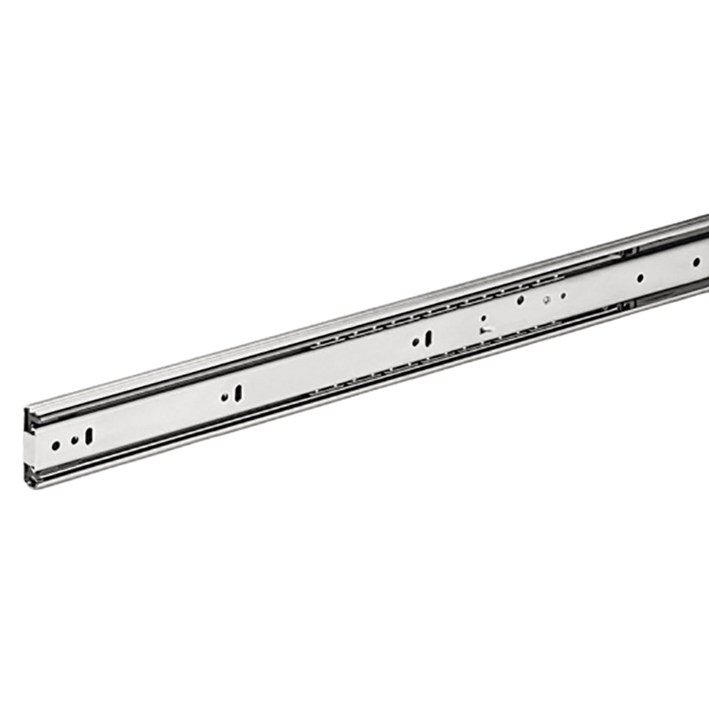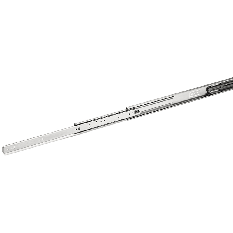 Stahl glanzverzinkt, mit Selbsteinzug und Dämpfung, Schnellentriegelung, die Schublade kann über Entriegelungshebel von der Führung getrennt werden, der Auszug wird im geschlossenen Zustand über Federkraft gehalten