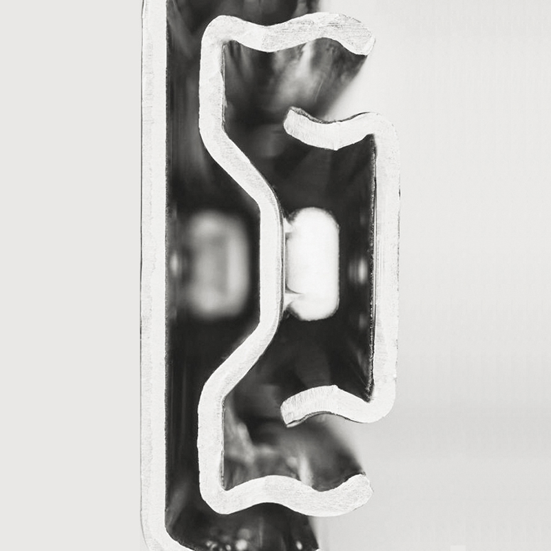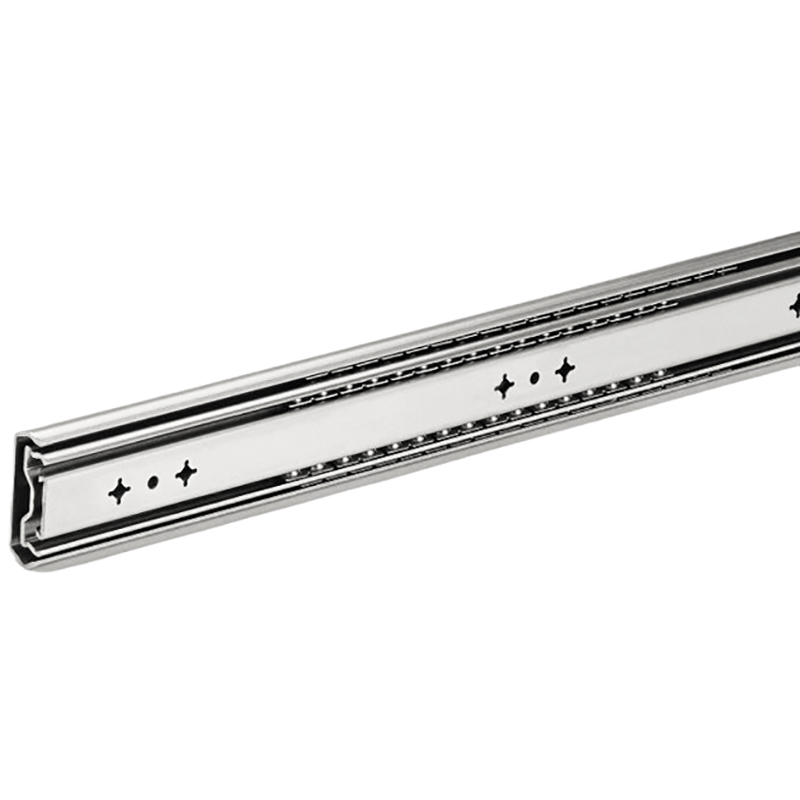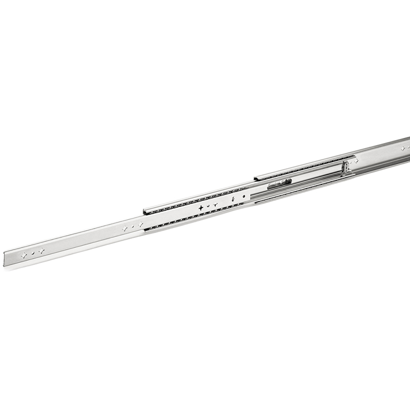 Stahl glanzverzinkt, mit Arretierfunktion, durch einen Gummipuffer wird der Auszug im geschlossenen Zustand gehalten, durch leichten Zug kann dieser überwunden werden