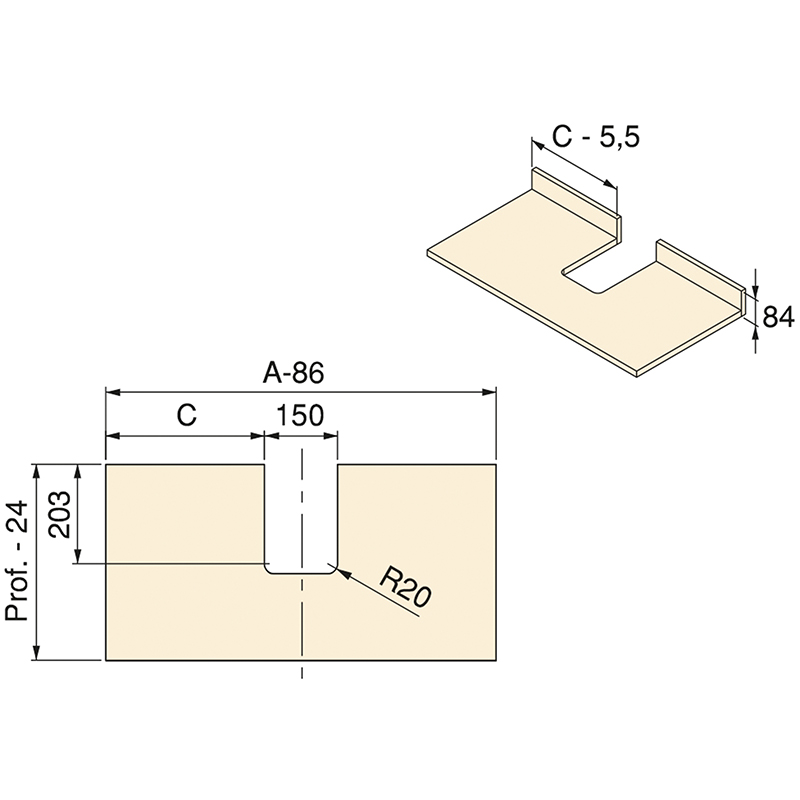 Kunststoff, System zur Herstellung von Schubladenausschnitten und Siphon-Lösungen, für Rückwandhöhe 84 mm, Rückwandstärke 16 mm