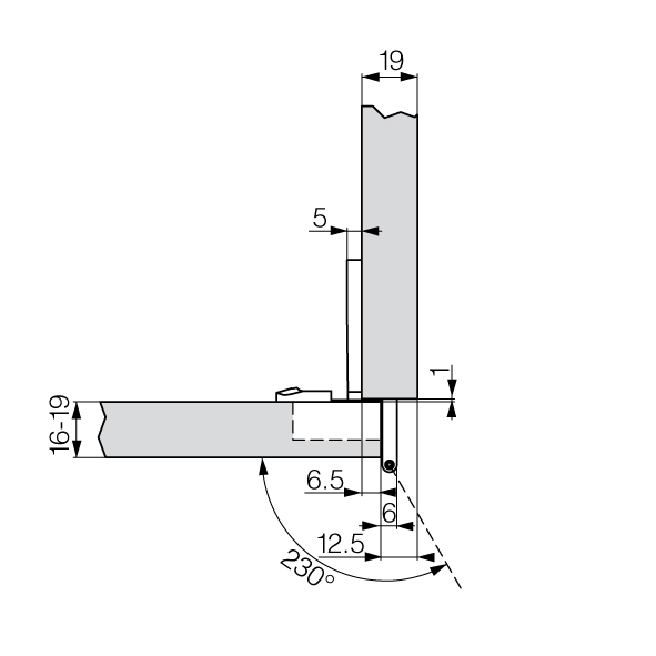 Zink matt vernickelt, Öffnungswinkel 230° bzw. 180°, Fuge 6 / 12,5 mm, werkzeuglose Tür-Clipmontage, Seitenverstellung - 2 mm, Höhenverstellung über Langlöcher +/- 2 mm