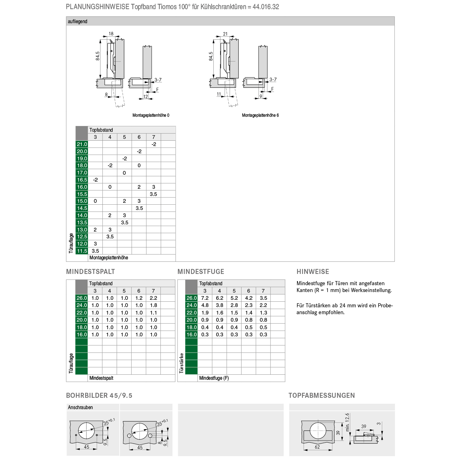 Topfband GRASS® Tiomos 100° Click-on, für Kühlschranktüren, Bohrbild 45 / 9,5