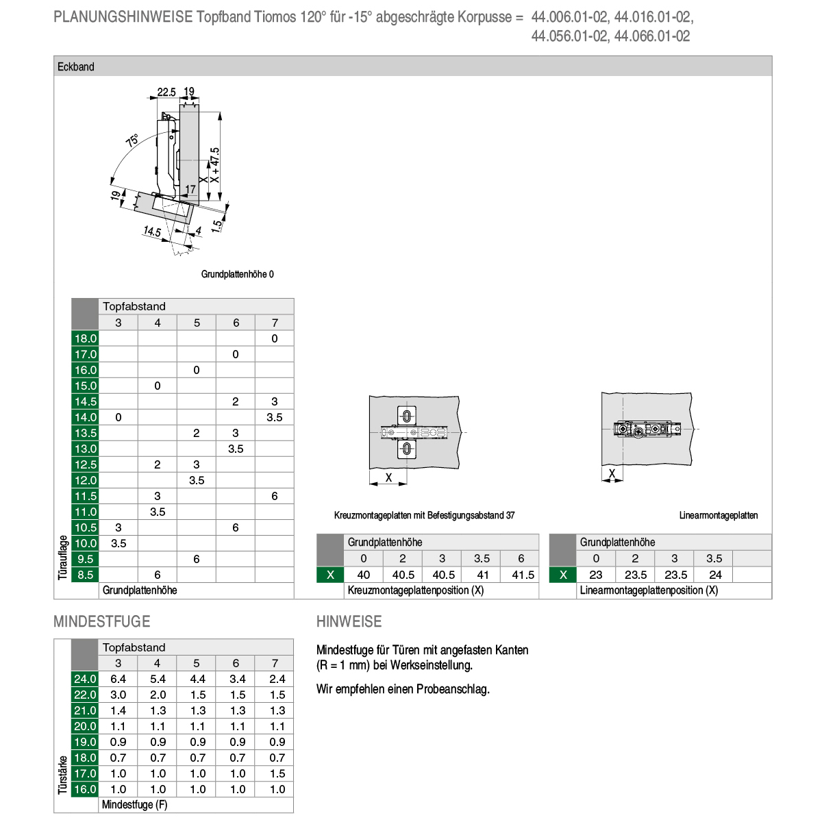 Topfband GRASS® Tiomos 120° Click-on, für -15° abgeschrägte Korpusse, Bohrbild 45 / 9,5