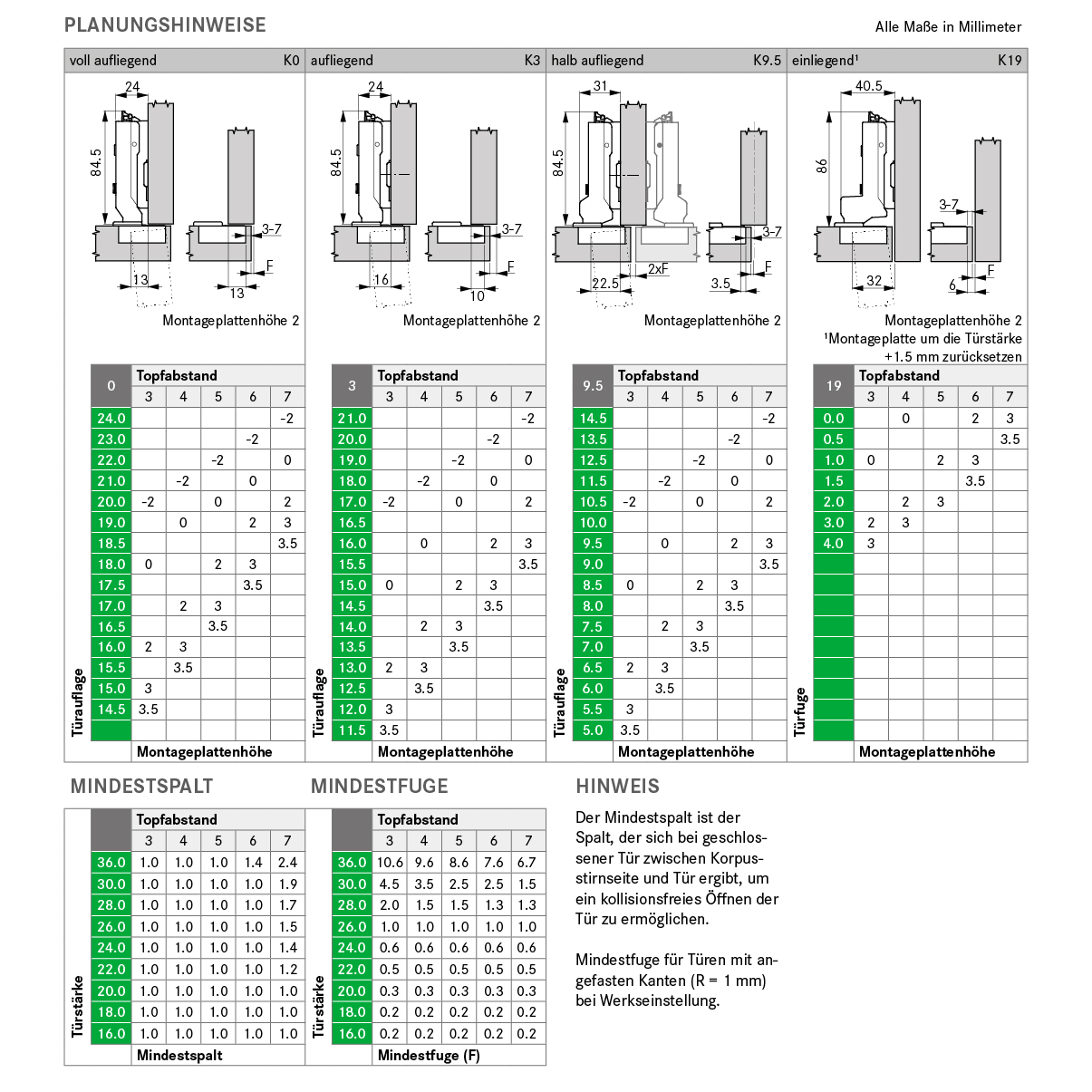 Stahl vernickelt, werkzeuglose Topfschnellmontage, Dämpfungs-Technologie unsichtbar im Scharnierarm integriert und in drei Leistungsstufen werkzeuglos einstellbar, Höhenverstellung ± 2,5 mm, Tiefenverstellung + 3 / - 2 mm, Seitenverstellung ± 2 mm, optimale Fugenwerte bis 28 mm Türstärke, ohne Abdeckkappe, ohne Grundplatte