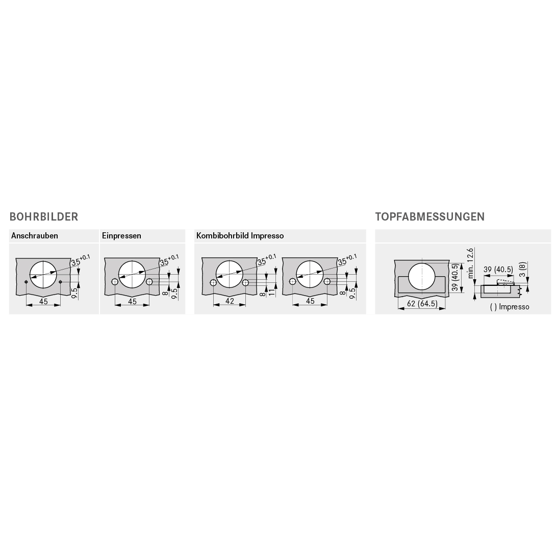 Topfband GRASS® Tiomos 95° Impresso, Kombibohrbild 42/11 / 45/9,5, für dicke Türen max. 28 mm