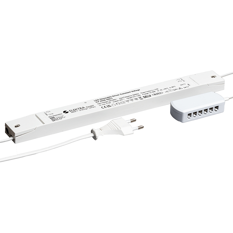 weiss, Dali-Funktion für Einbindung in Smart Home Anlage, Primärleitungen 2000 mm mit Euroflachstecker, Sekundäranschluss LED mit 12-fach Verteiler, 24 Volt DC, Push dimmfähig / flickerfrei