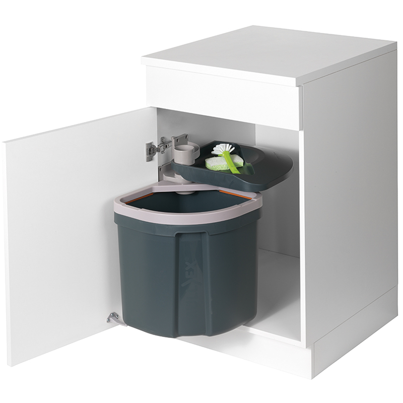 für Elemente mit scharnierten Türen, Kehrichtbehälter aus Kunststoff, mit flexiblem Sackspannsystem für 35 und 17 Liter Säcke, einfaches Ein- und Aushängen des Behälters, einfache Montage
