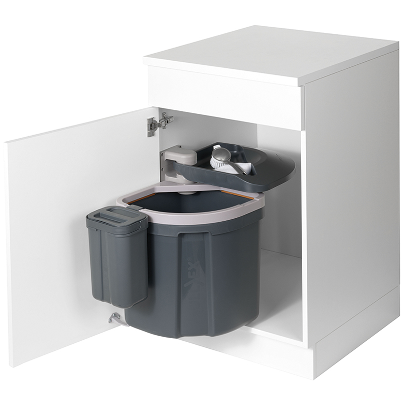 für Elemente mit scharnierten Türen, Kehrichtbehälter aus Kunststoff, mit flexiblem Sackspannsystem für 35 und 17 Liter Säcke, einfaches Ein- und Aushängen des Behälters, einfache Montage