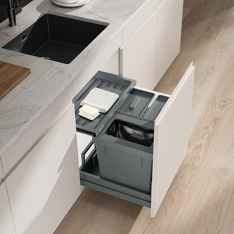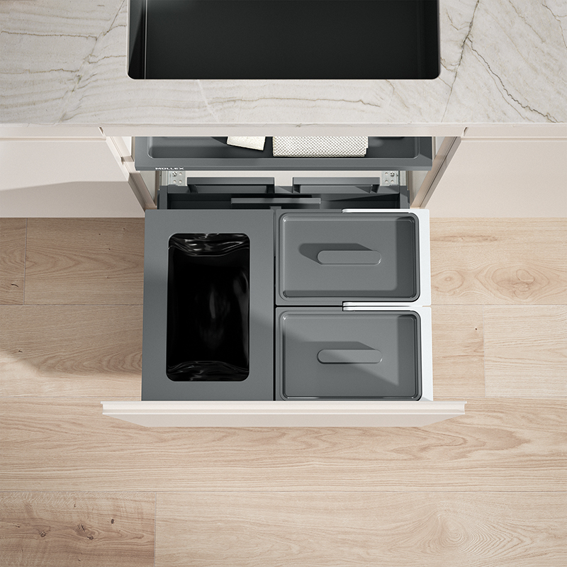 Dieses niedrige Komplettset für Korpusbreiten von 550 mm wurde für Haushalte konzipiert, die eine Müllsammlung mit 17 Liter Abfallsäcken bevorzugen und deshalb einen kleineren Hauptbehälter benötigen, neben dem 20 Liter fassenden Hauptbehälter bietet dieses Abfallsystem noch mehr Platz für die Sammlung von Recyclinggütern, zwei 10 Liter Zusatzbehälter bieten Raum für Biomüll, Kaffekapseln und Geschirrspültabs aber auch für Putzutensilien und Co. Weiteren Stauraum für Spülschwämme und Co. bietet die Schublade Basic, das System wird mit dem robusten Komplettschubkasten Pro geliefert