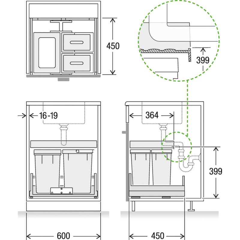 Dieses niedrige Komplettset für Korpusbreiten von 600 mm wurde für Haushalte konzipiert, die eine Müllsammlung mit 17 Liter Abfallsäcken bevorzugen und deshalb einen kleineren Hauptbehälter benötigen, neben dem 20 Liter fassenden Hauptbehälter bietet dieses Abfallsystem noch mehr Platz für die Sammlung von Recyclinggütern, zwei 10 Liter Zusatzbehälter bieten Raum für Biomüll, Kaffekapseln und Geschirrspültabs aber auch für Putzutensilien und Co, die im Set integrierte Schubalde Premium mit Vollauszug kann als obere Ablagefläche für Spülschwämme oder ähnliches genutzt werden, das System wird mit dem robusten Komplettschubkasten Pro geliefert