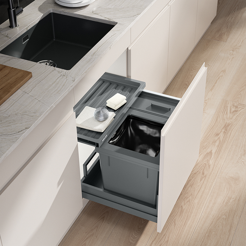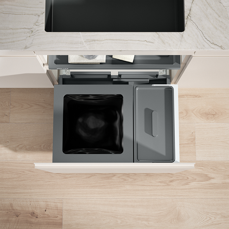 Dieses niedrige Komplettset für die Koprusbreite 600 mm bietet einen grossen Zusatzbehälter für noch mehr Platz zum Recyclen und Verstauen, ausgestattet mit einem 35 Liter fassenden Hauptbehälter und einem 15 Liter grossen Zusatzbehälter bietet das Abfallsystem genügend Raum für den gemischten Haushaltsmüll und Recyclinggüter, weiteren Stauraum für Spülschwämme und Co. bietet die Schublade Basic, das System wird mit dem robusten Komplettschubkasten Pro geliefert