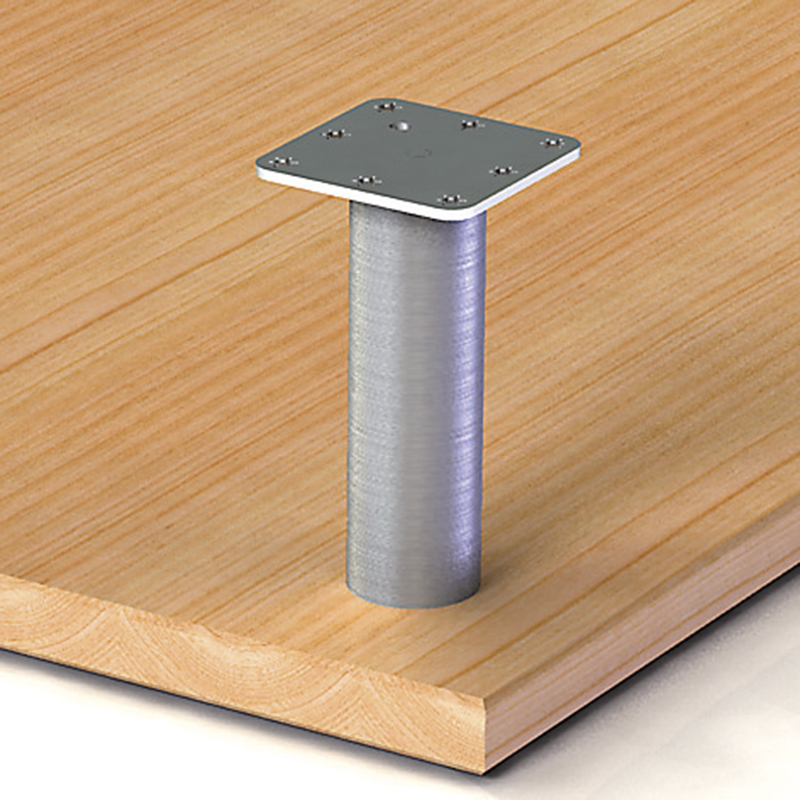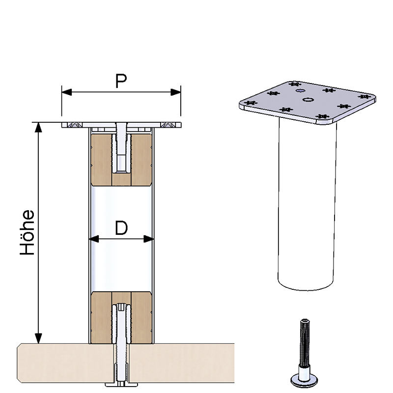 Rundrohr Ø 50 mm, Höhe 170 mm, Befestigungsplatte 92 x 92 x 4 mm, mit Gewindestift M8, Loch-Ø 6 mm, Zentrumloch Ø 8 mm, zum Anschrauben, Leimen