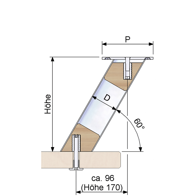 Vierkantrohr 50 x 50 mm, Höhe 170 mm, Befestigungsplatte 92 x 92 x 4 mm, mit Gewindestift M8, Loch-Ø 6 mm, Zentrumloch Ø 8 mm, zum Anschrauben, Leimen