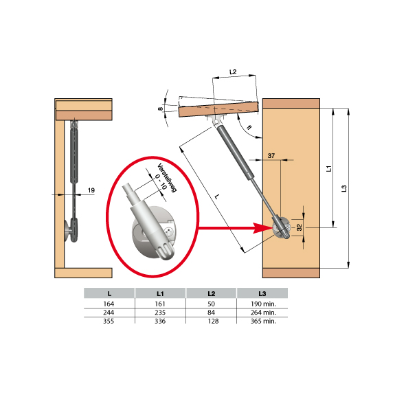 vernickelt mit Gasdruck-Zylinder, hebt die Türe bis zur maximalen Öffnung an, der Hebevorgang wird anfangs zügig ausgeführt und kurz vor der vollständigen Öffnung sanft abgebremst, ohne Montageteile