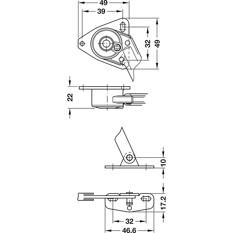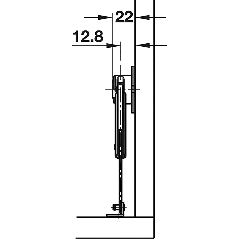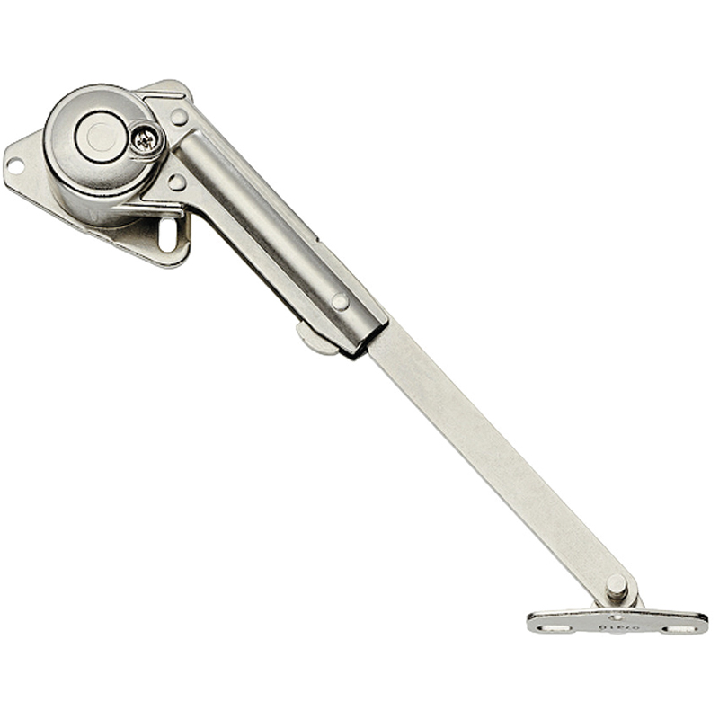 Stahl vernickelt, Öffnungswinkel 90°, mit Winkelfuss für Klappen aus Holz, mit Anschraubplatte für Klappen aus Aluminiumrahmen, mit regulierbarer Bremswirkung durch Drehen der Schraube