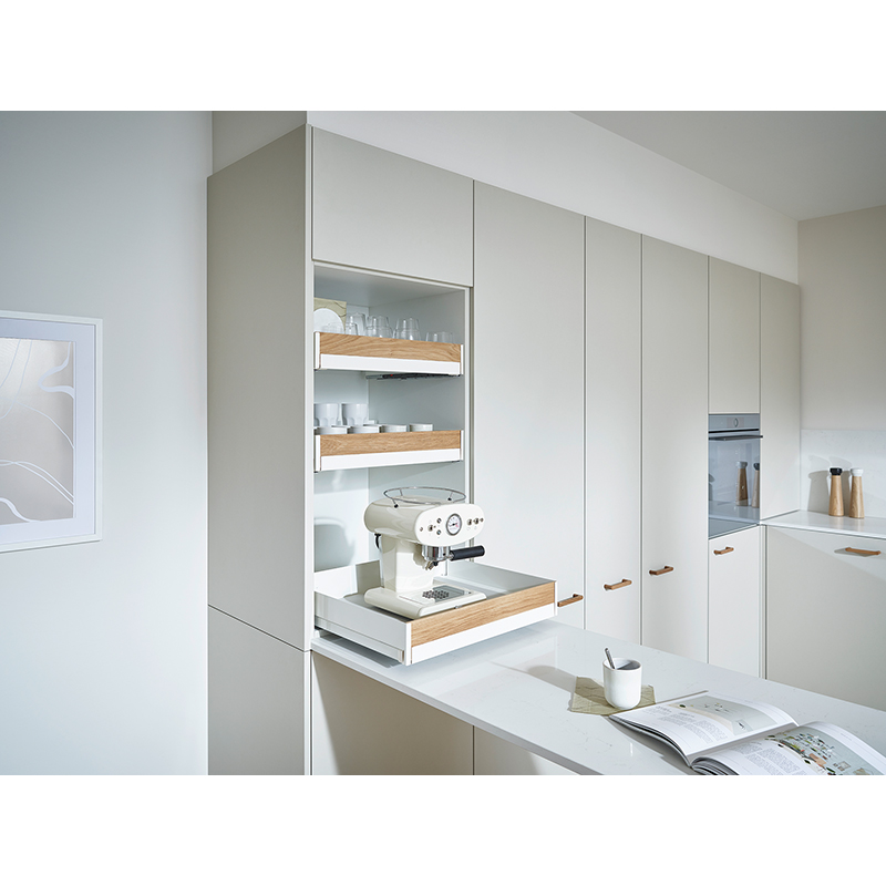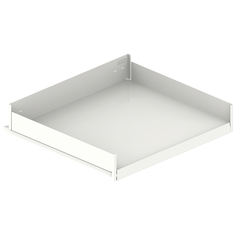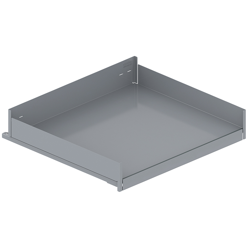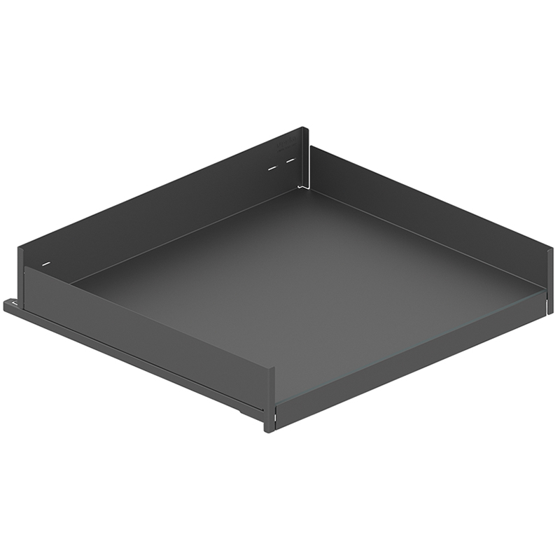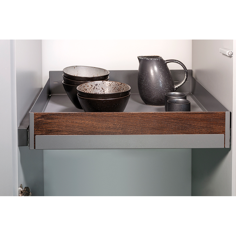 Tablar ohne Distanzleiste, für Schubkastenführung Grass Dynapro, optional mit Relingeinsätzen aus Holz zur zusätzlichen Materialisierung, kompatibel mit Auszugsarretierung Click Stop, geeignet für offene Tablarschränke, als Innenauszug hinter Frontauszügen, hinter Schiebetüren, oder bei scharnierten Türen mit 0-Einsprung-Scharnier, ohne Unterflur-Führungssystem (Nennlänge 500 mm), ohne Zubehör