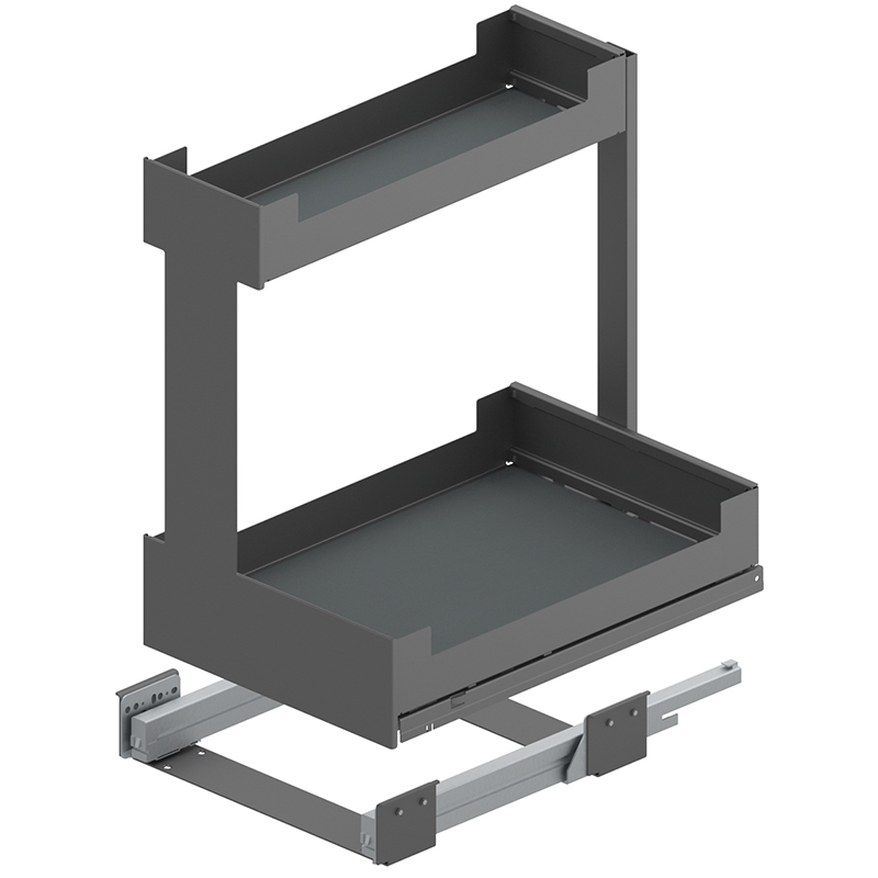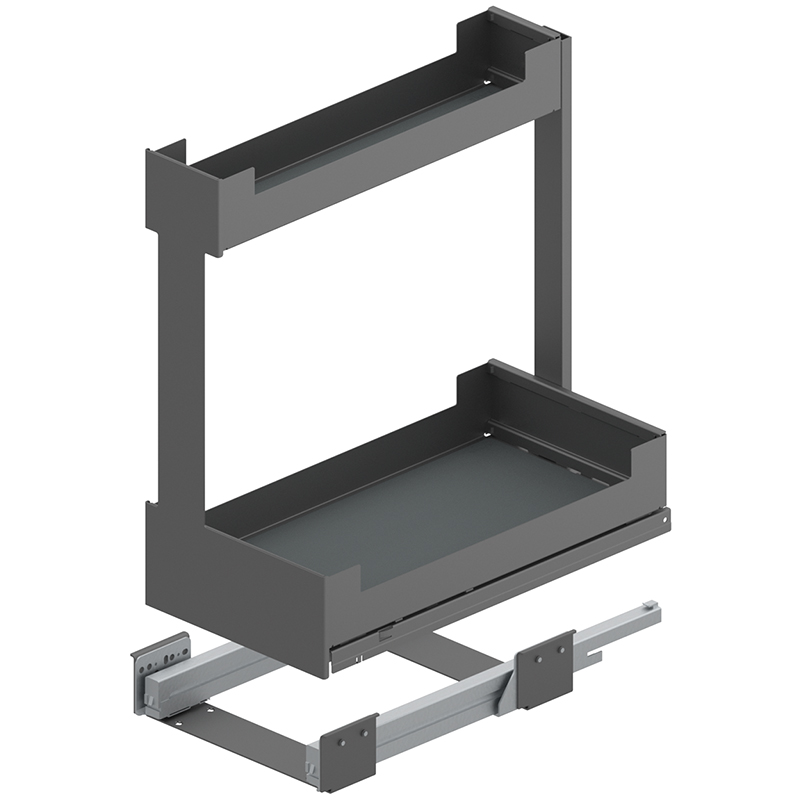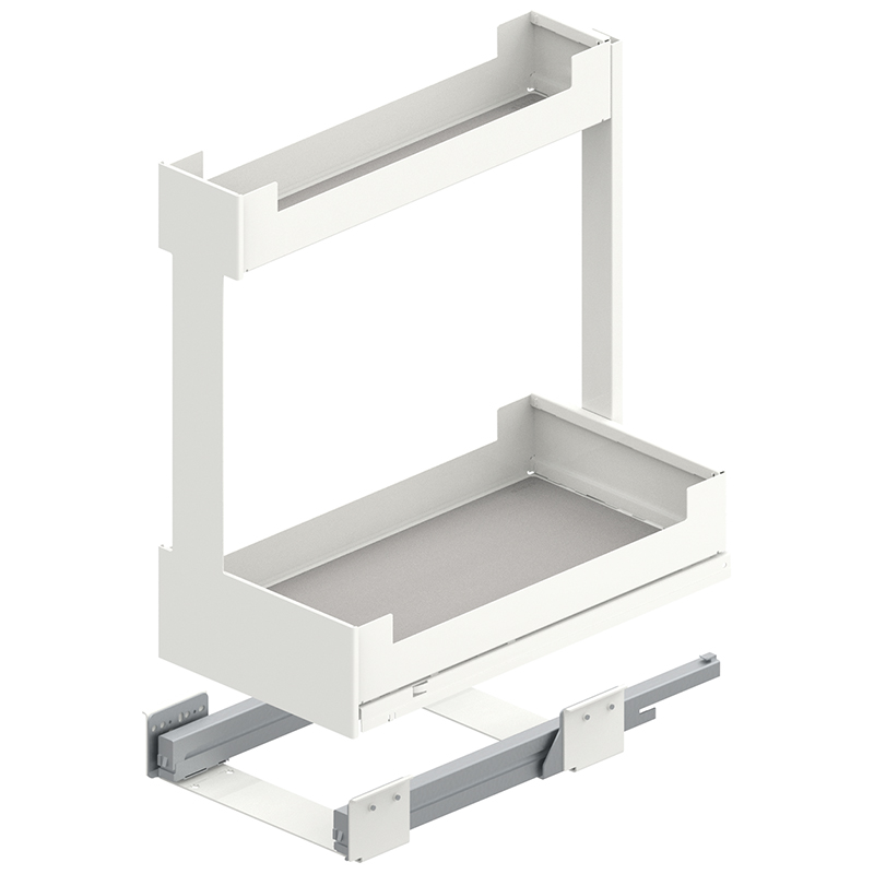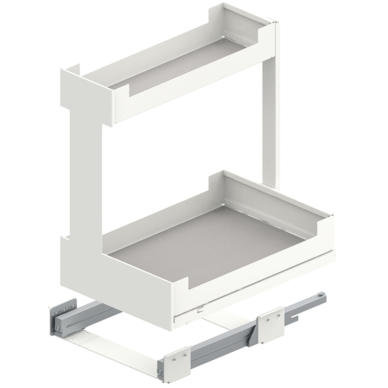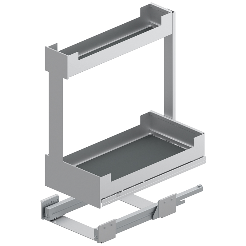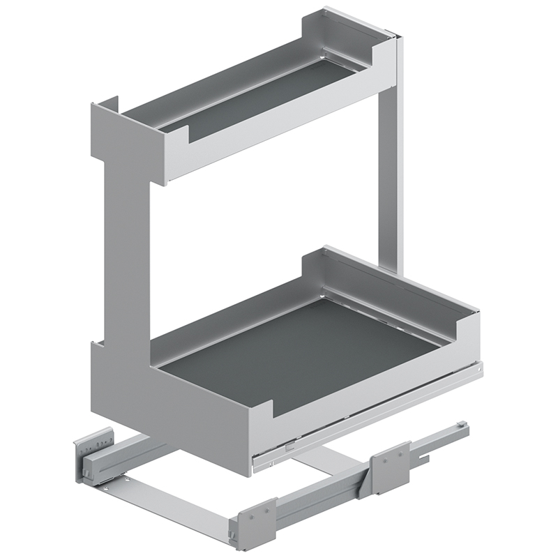 Stahlblech pulverbeschichtet, Vollauszug, integrierter Softclose, Frontauszug öffnen und Innenauszug mit 2 Etagen Staufläche herausziehen, Tragkraft 0 - 25 Kilo, mit Korpusschiene Nova Pro, ohne Relingeinsatz-Set