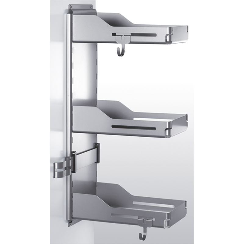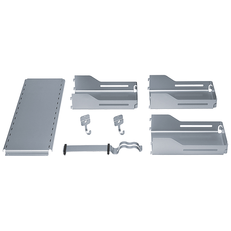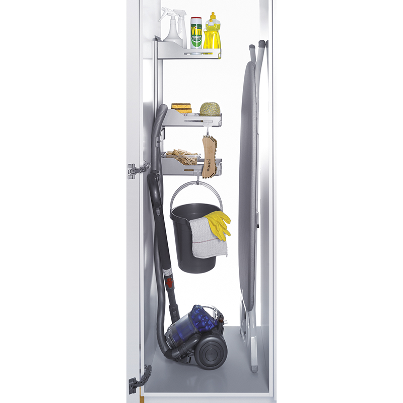 Stahlblech beschichtet, links und rechts an der Seitenwand montierbar, das Einhängesystem nutzt und organisiert das gesamte Schrankvolumen, selbst ein Bügelbrett oder Wäscheständer kann seitlich noch eingeschoben werden, der Schlauchhalter, die Einhängetablare und Haken können individuell dem Staugut angepasst werden, Tablare mit geschlossenem Boden verhindern das Umfallen von Flaschen oder Durchfallen von Kleinutensilien