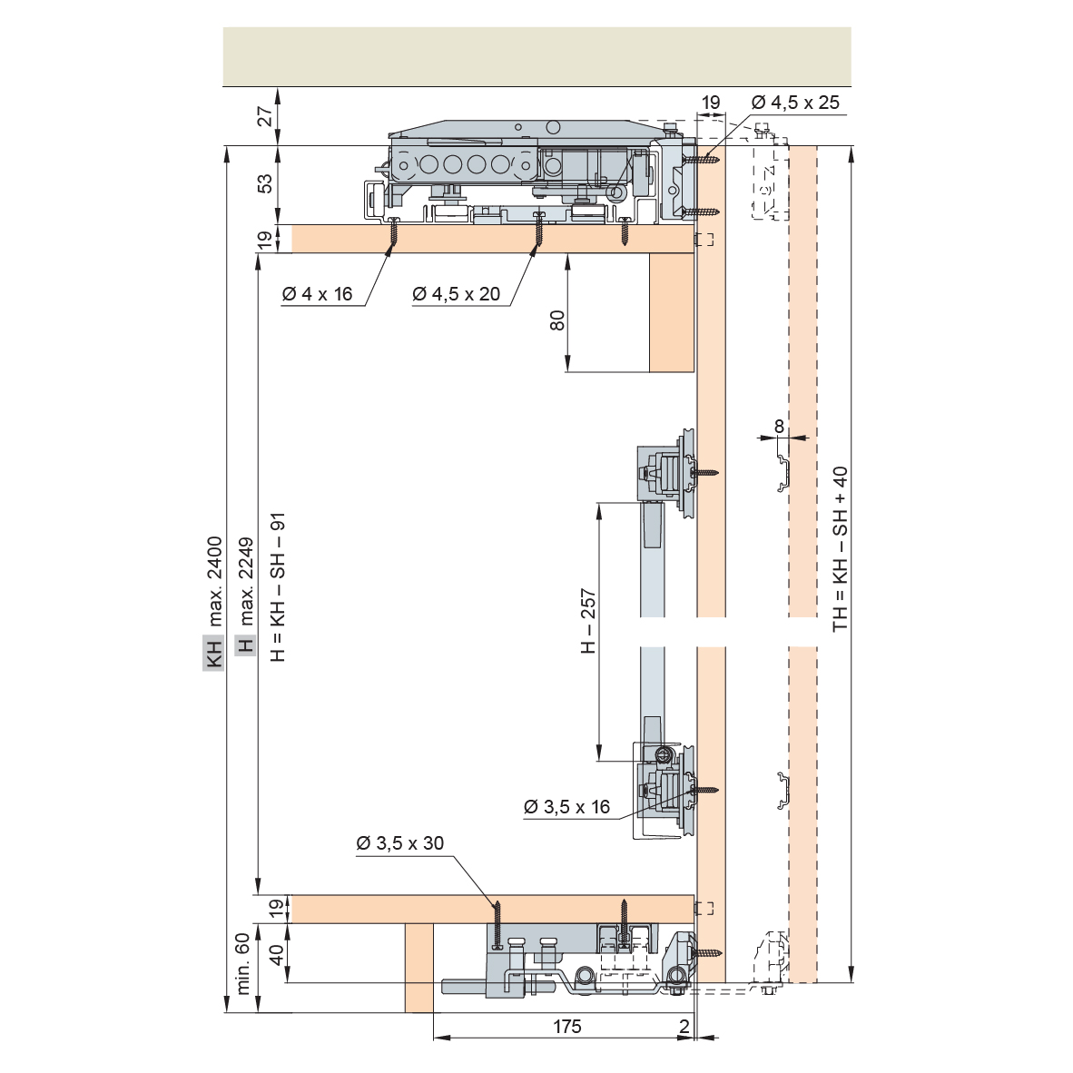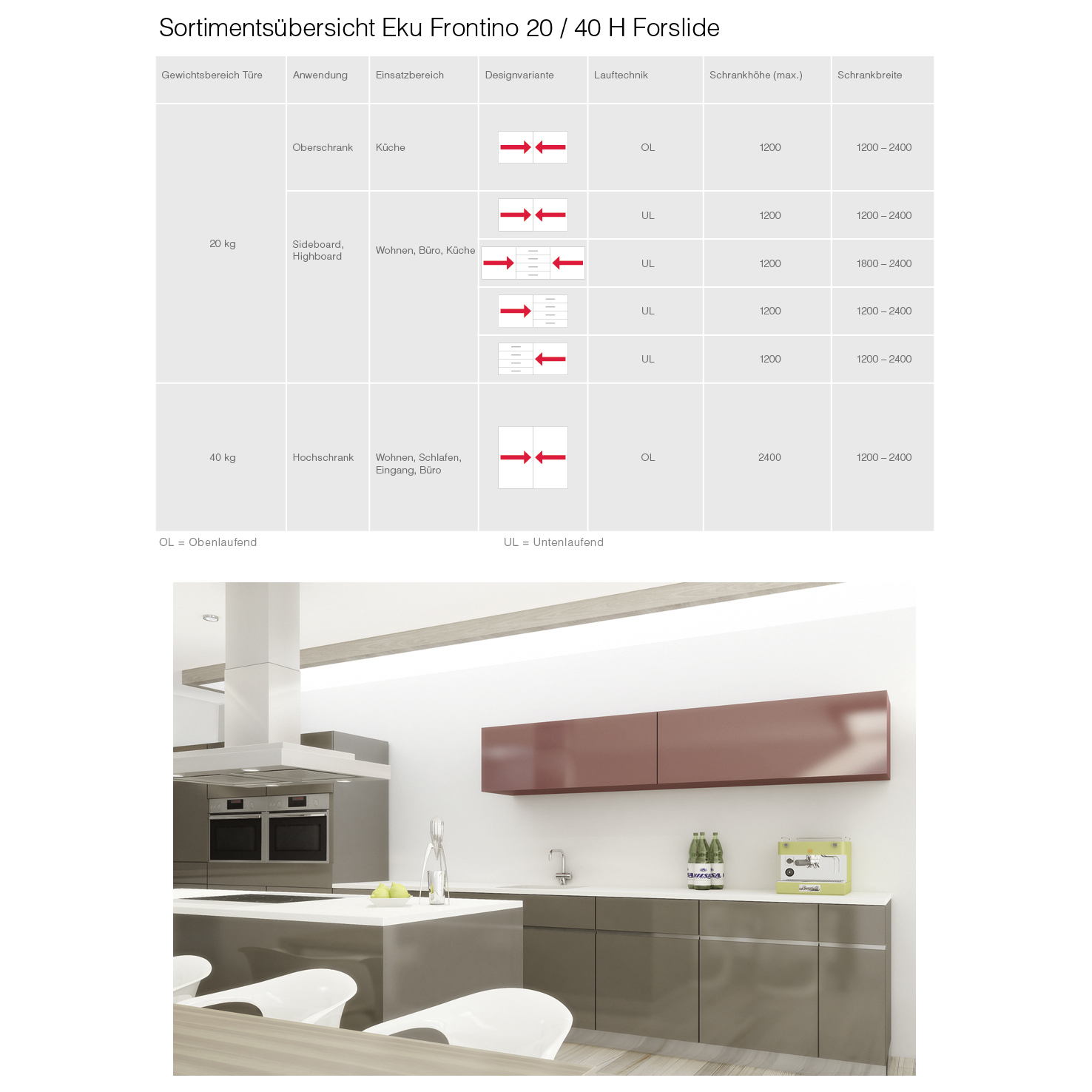 für obenlaufende, symmetrische Holzschiebetüren bis 40 Kilo, Türdicke 19 mm, Türgrösse (Breite x Höhe) max. 1200 x 2400 mm, hohe Türstabilität dank 4-Punkt-Führung, hoher Bedienungskomfort, gedämpfte Schliessbewegung, Lauf- und Führungsschienen Aluminium farblos eloxiert, gebohrt zum Aufschrauben, ohne Korpusbearbeitung, flexible Schrankbreiten, Schienenset kann individuell gekürzt werden, höhen- und breitenverstellbar ± 5 mm, ohne Schienenset