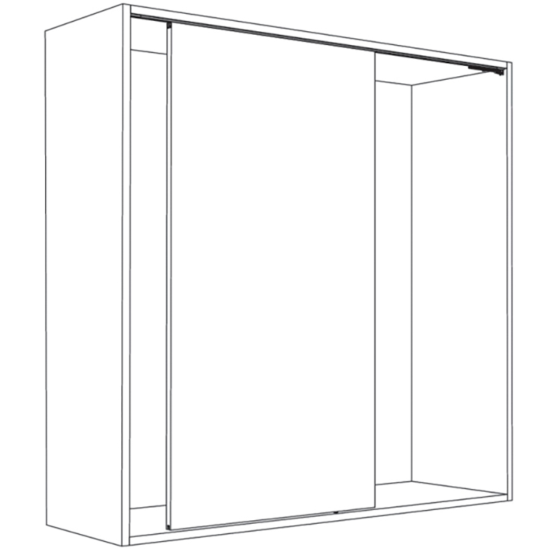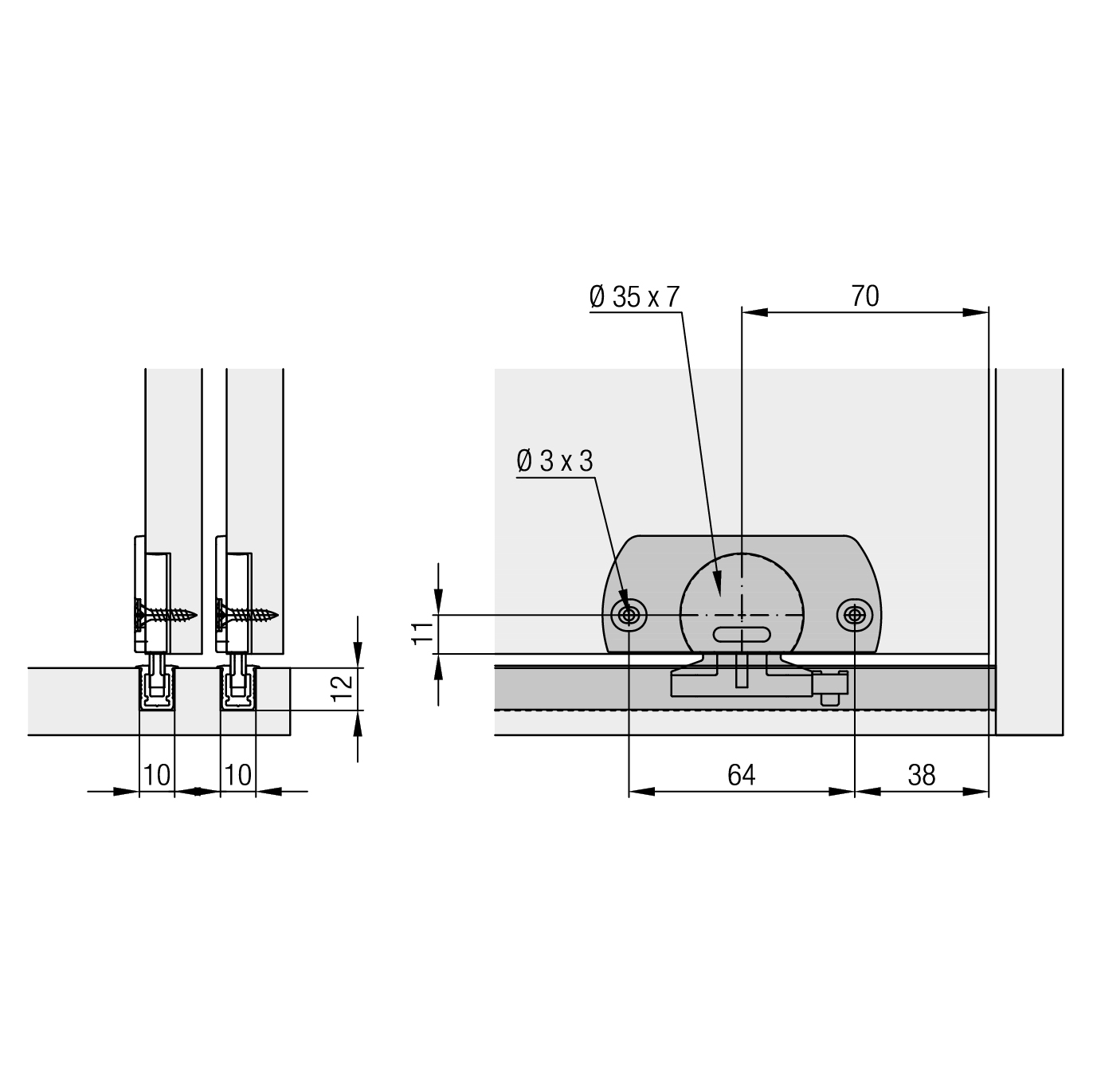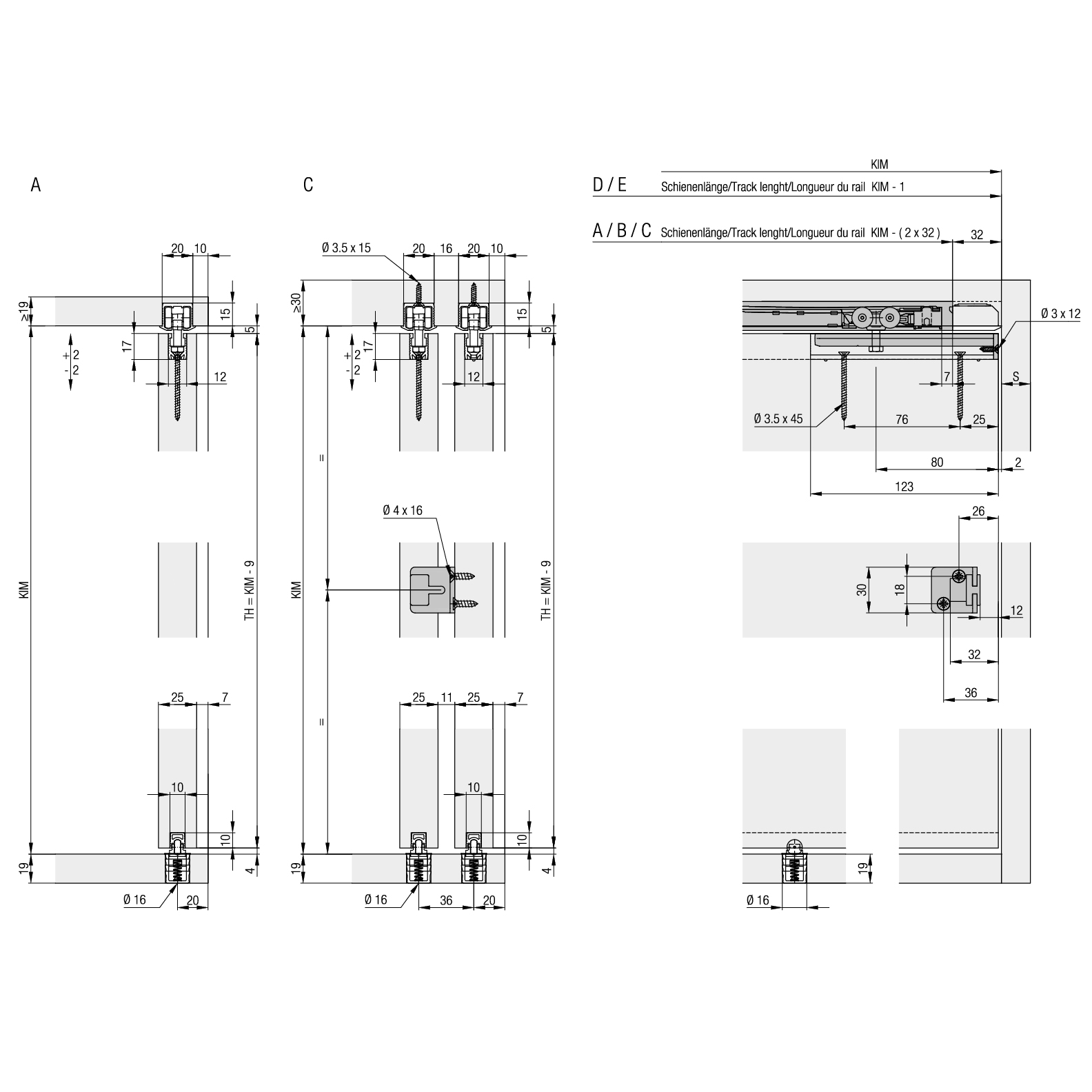 für oben im Korpus laufende Schrankschiebetüren aus Holz bis 36 Kilo, Türgrösse (Breite x Höhe) max. 1000 x 2400 mm, Türdicke 19 - 25 mm, die Laufschiene wird eingenutet, im Boden hat es keine Nut, Laufwerk für verdeckte Montage, ohne Laufschienen, ohne Zubehör