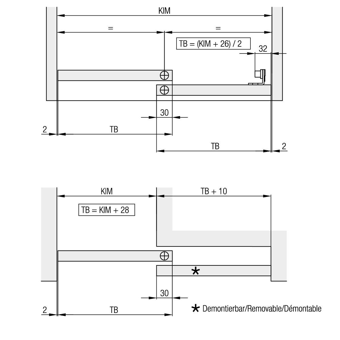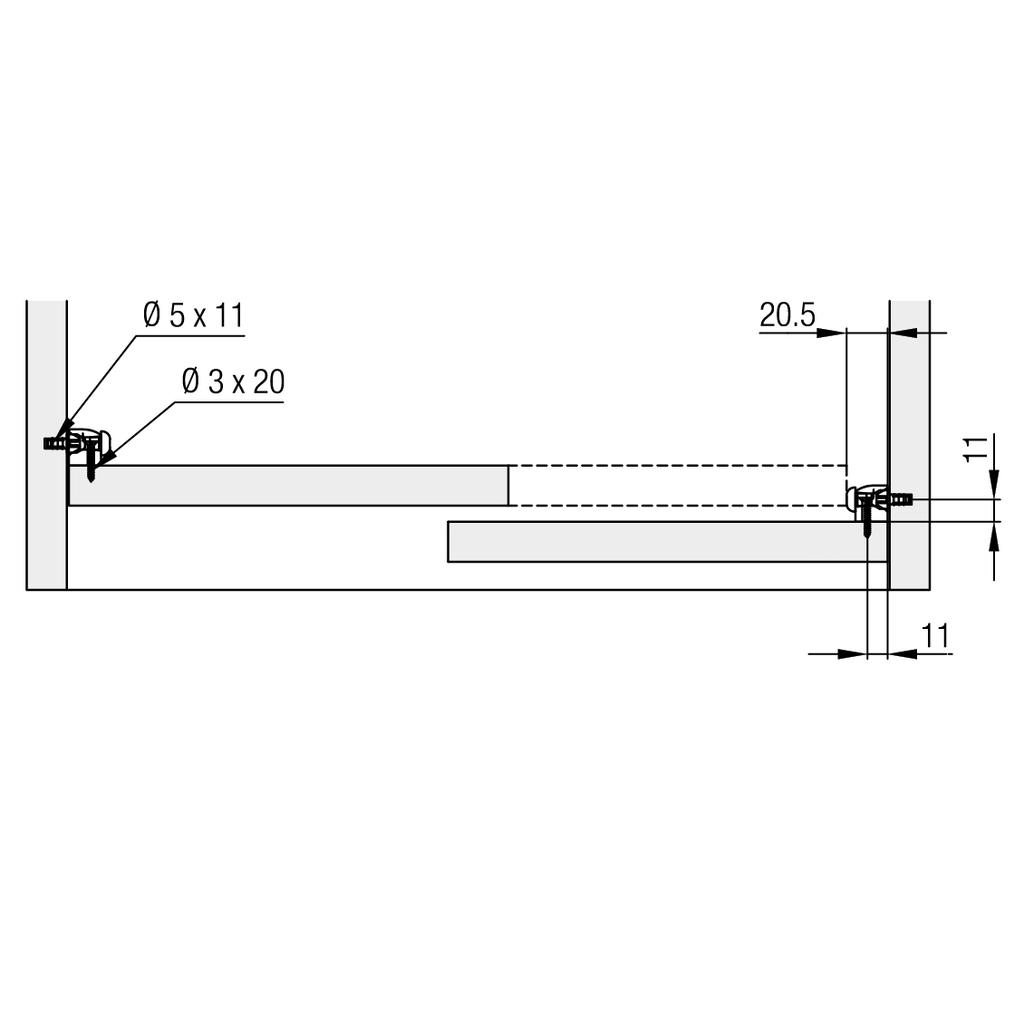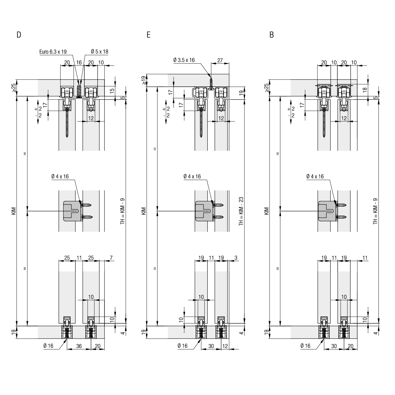 für oben im Korpus laufende Schrankschiebetüren aus Holz bis 36 Kilo, Türgrösse (Breite x Höhe) max. 1000 x 2400 mm, Türdicke 19 - 25 mm, die Laufschiene wird eingenutet, im Boden hat es keine Nut, Laufwerk für verdeckte Montage, ohne Laufschienen, ohne Zubehör