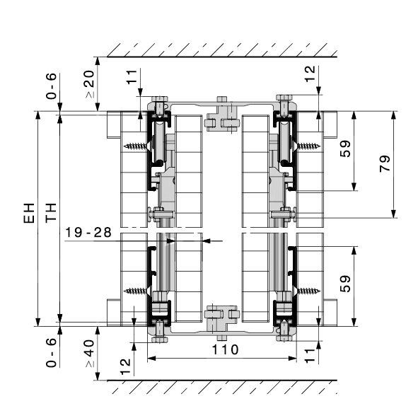 Aluminium farblos eloxiert, zu Korpus aus Holz, für 2 Dreh-Einschiebetüre, Breite 110 mm, Verbindungsprofile sind eine durchdachte Montagevereinfachung für Konstruktionen mit auf Boden und Oberboden aufschlagenden Dreh-Einschiebetüren
