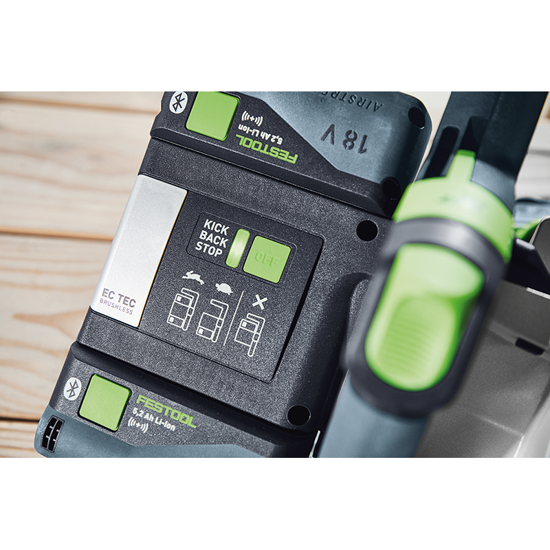 KickbackStop vermindert die Verletzungsgefahr durch einen Rückschlag beim Sägen oder beim Eintauchen in das Werkstück, geballte Durchzugskraft und bis zu doppelt so schneller Arbeitsfortschritt bei erhöhter Sägeblatt-Standzeit, bürstenloser EC-TEC Motor kombiniert mit Lithium-Ionen-Akkus für maximale Schnittleistung, mobil staubarm arbeiten, dank Staubfangbeutel oder einem Sauger mit Bluetooth Einschaltautomatik, Deaktivierung des KickbackStops möglich, präzise Schnitte doppelt so schnell und kraftvoll bei gleichzeitig höherer Akku-Reichweite