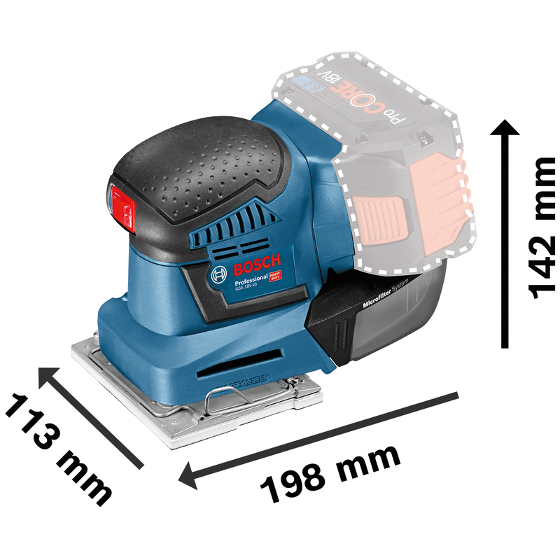 der kompakte Akku-Schwingschleifer, passend für jede Ecke, flexibles Arbeiten in jeder Situation durch 18 V Akku, Bosch Microfilter System für effiziente Staubabsaugung, ergonomische Bauform mit Softgripflächen für unterschiedliche Griffpositionen, Schleifplatte vom GSS 18 V-10 kann sowohl Klett- als auch Klemmpapier aufnehmen, perfekter Halt des Papieres ohne flattern und reissen, lange Lebensdauer durch abgedichtete Kugellager und robuste Bauweise, ohne Akku, ohne Ladegerät,