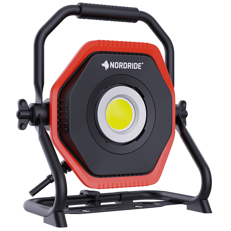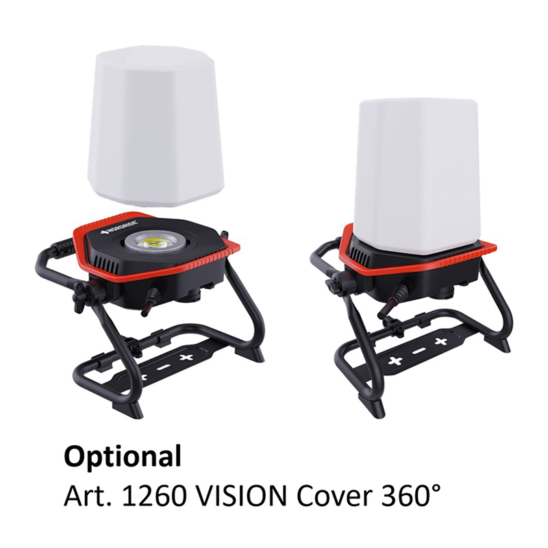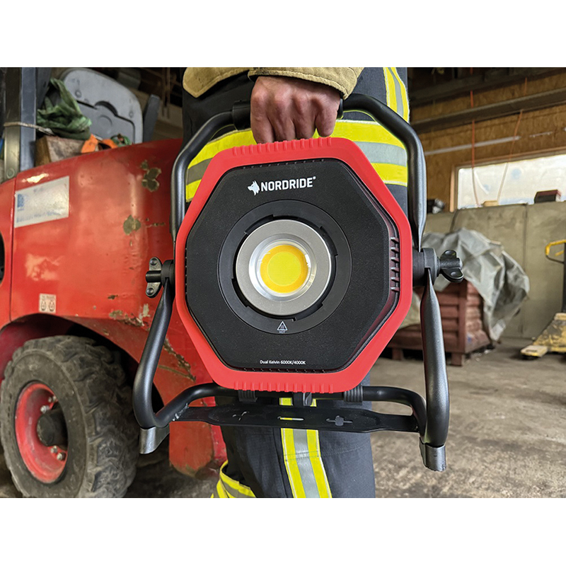 robuster COB LED Dual-Kelvin Hochleistungsstrahler für den Profianwender: Leuchtstärke 10'000 Lumen in gleichmässiger Ausleuchtung (Linsentechnologie), selektierbares Arbeitslicht (Dual Kelvin) von Tageslichtweiss (6000K) zu Neutralweiss (4000K), inklusive individuell montierbarem Diffusor, gute Farbwiedergabe (CRI/Ra >80), 4 Leuchtstärkestufen (25% / 50% / 75% / 100%), 230V Steckdose, bruch- und stosssicheres Gehäuse mit Gummischutzrahmen, vielseitig verstellbar zur flexiblen Ausleuchtung, stabiler Griff und Fussteil mit Stativaufnahme und Haken, Sicherungs-Funktion von Griff und Fussteil zur Montage auf Leiter, Gerüst, etc., der ideale Allzweckstrahler als Ersatz von 1000W Halogen Strahler für die Feuerwehr, Werkstatt und Handwerker (Elektriker, Schreiner, Zimmermann, Maler, Gipser, Tapezierer, Fliesenleger etc.), optional: 360° VISION Cover erweitert den LUMOS Baustrahler zu einer 360 Grad Ausleuchtung