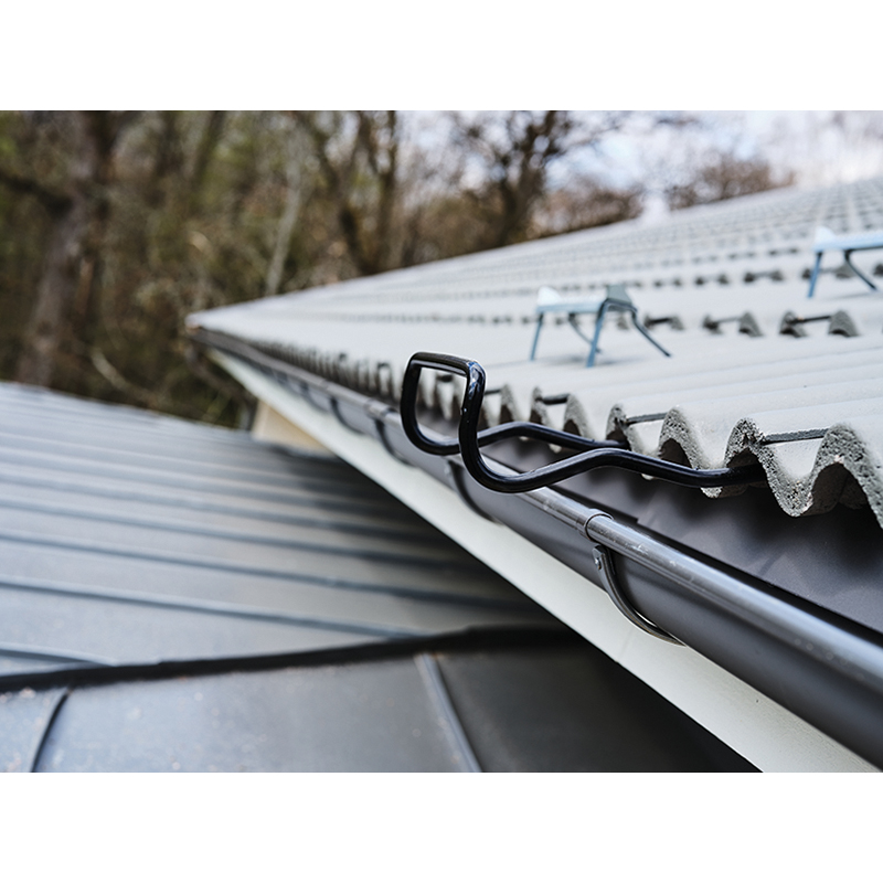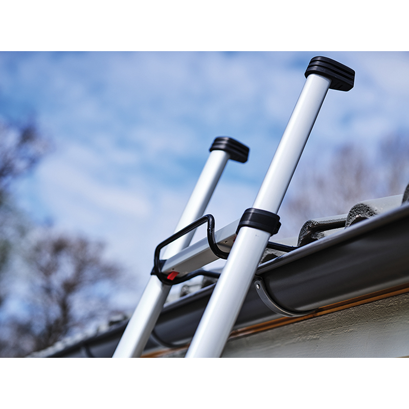 die Rutschsicherung sorgt dafür, dass die Leiter fest steht und nicht in irgendeine Richtung rutschen kann, kann in der Rohdachlatte oder in der Dachreling mit 4 rostfreien Holzschrauben in den kleineren Löchern oder mit 2 M10 Schrauben und Muttern in den grösseren Löchern montiert werden