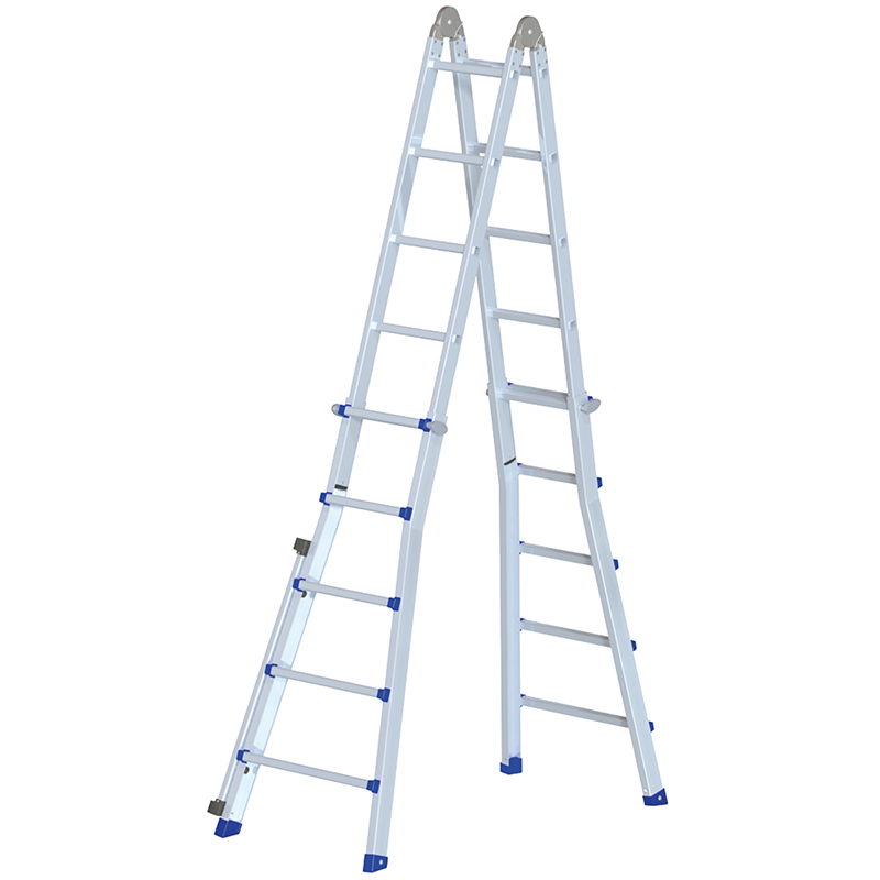 leichte Bedienung, als Anlege- und Bockleiter, sowie Treppenleiter einsetzbar, geringer Platzbedarf für Transport und Lagerung, ideal für den Einsatz auf Treppen, in Hallen und Sälen etc., verstärkter Spross bei Schweissverbindung, starkes, selbstarretierendes Stahlgelenk, Arretierungsbolzen aus Aluguss