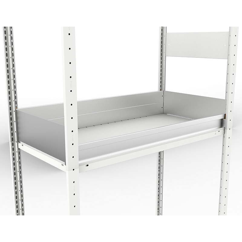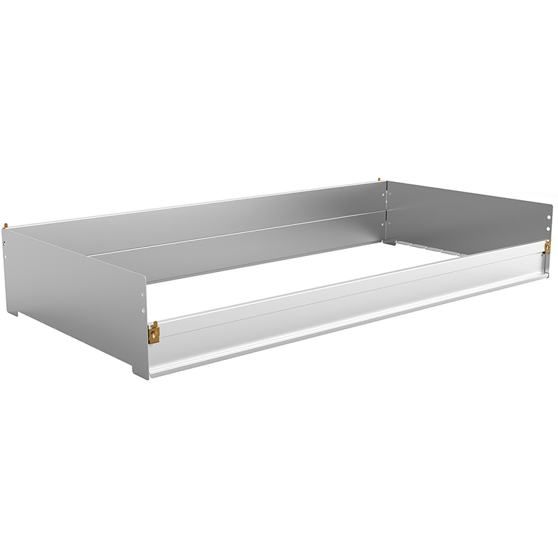 Lieferumfang: 1 Schüttgutleiste 75 mm hoch (vorne), 2 Schüttgutleisten à 75 mm = 150 mm hoch (hinten), 2 Seitenbleche 150 mm hoch, Befestigungsmaterial für Schüttgutleisten, ohne freistehende Fachteiler
