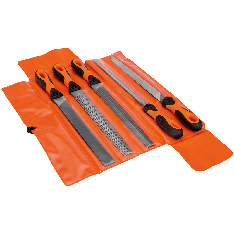 Lieferumfang: Je eine Ansatz-, Halbrund-, Rund- und Dreikantfeile sowie eine halbrunde Raspel, Kunststoff-Rolltasche