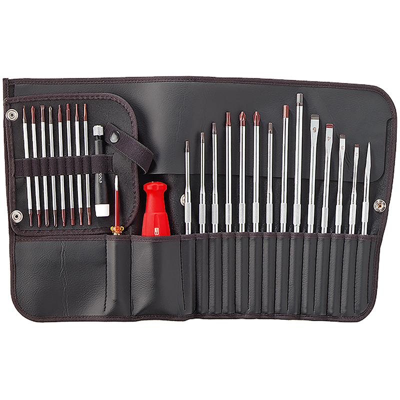 31-teilig, in Etui, bestehend aus: 1 Kunststoffgriff SwissGrip, 5 Klingen für Schlitzschrauben Grösse 0, 2, 3, 4 und 5, 1 Klinge für Phillips-Kreuzschlitz Grösse 2, 2 Duplex - Doppelklinge für Torx Grösse 6 - 7, 8 - 9, 4 Klingen für Torx Grösse: 10, 15, 20, 25, 2 Duplex - Doppelklingen für Innensechskant Grösse (mm) 1,5 - 2, 2,5 - 3, 3 Klingen für Innensechskant Grösse (mm) 4, 5, 6, 3 Duplex - Doppelklingen für Schlitz-Phillips Grösse 00, 0, 1, mit Vierkant-Ahle und Spannungsprüfer 110 - 250 V