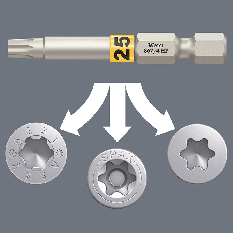 Bit-Set, besonders geeignet für die Holzbearbeitung, die Bits 867/4 TORX® HF halten durch ihre spezielle Geometrie TORX® Schrauben nach Spezifikation Acument Intellectual Properties sicher auf dem Werkzeug, das ist besonders hilfreich in schwer zugänglichen Arbeitsbereichen, wo man die zweite Hand nicht zum Festhalten der Schraube nutzen kann, passend für Würth AssY Schrauben sowie Altenloh SPAX T-STAR plus Schrauben, mit Werkzeugfinder Take it easy, Farbkennzeichnung nach Grössen, ermöglicht einen schnellen Überblick über das vorhandene Werkzeug, nicht benötigte Bits werden einfach ins Sortiment zurückgesteckt und gehen nicht verloren, einfacher Transport z. B. in der Hemdtasche, am Arbeitsplatz kann der Bit-Check aufgestellt werden, was einen schnellen Zugriff auf das Werkzeug gewährleistet