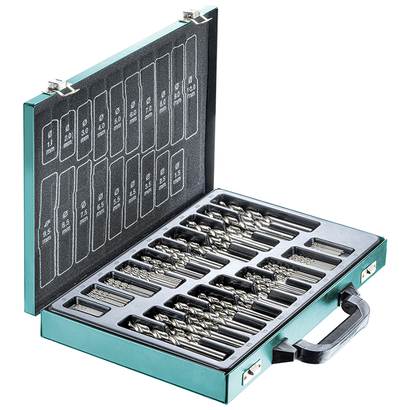 Industrie-Qualität, nach DIN 338, Typ N, geschliffene Ausführung, Spitzen mit Kreuzanschliff / Winkel 135°, rechtsschneidend. In Metallkoffer mit Kunststoffeinlage,