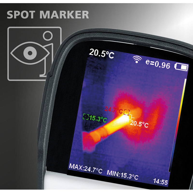 kompakte Thermokamera für Anwendungen im Bauwesen, Elektrotechnik und Maschinenbau mit WLAN-Schnittstelle, Infrarot-Sensor mit 220 x 160 Pixel Auflösung ermöglicht eine schnelle und einfache Messung zur Bewertung von Temperaturprofilen, zentraler Messpunkt zur Temperaturanalyse und zusätzliche Heiss-/Kaltpunktmessung, Datenübertragung und Steuerung per WLAN, mit Anzeige des Infrarot Livebildes